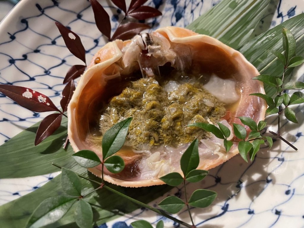 北海道の殻付き帆立 肝と白子は湯引きで