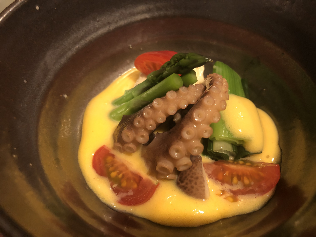 飯たこ煮 2019年2月21日未分類robin-kyoto こんにちは。 本日は3月からの新メニューの試作がありましたのでご報告です。 今回は飯たこの柔らか煮と旬の野菜の黄身クリームかけです。 柔らかく仕上げた飯タコは頭はしっかり火通して足はレアに皮がきれいに残るように仕上げます。 旬の野菜はアスパラやトマト 九条ネギなどが入り黄身クリームのコクと出汁の旨味が飯たこと野菜に絡まって食べ応えもある一品ですね。 コースの冷し鉢にて登場します。 もちろん単品もございます。 是非