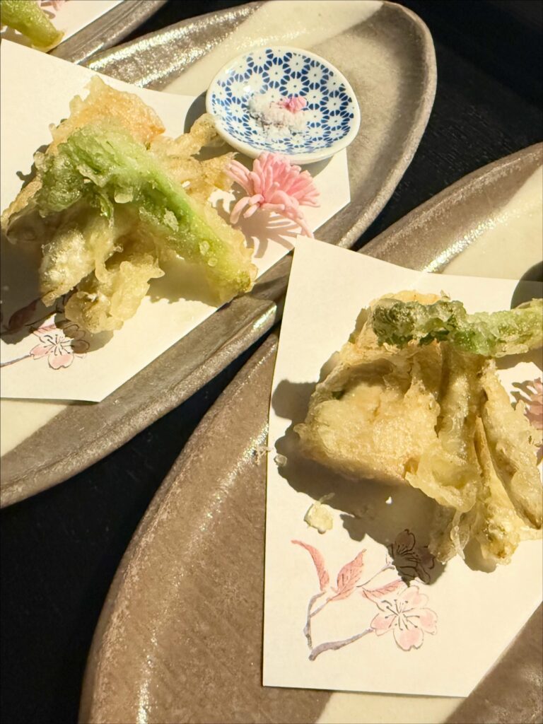 本日は稚鮎がそろそろ出だしますので山菜 独活やタラの芽 こしあぶらなどとご一緒に木の芽の天ぷらとお楽しみください。